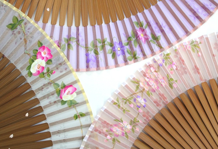 薄生地の扇面に舞扇堂絵師・大成睦穂が桜、鉄線、椿を上品に描き上げました。